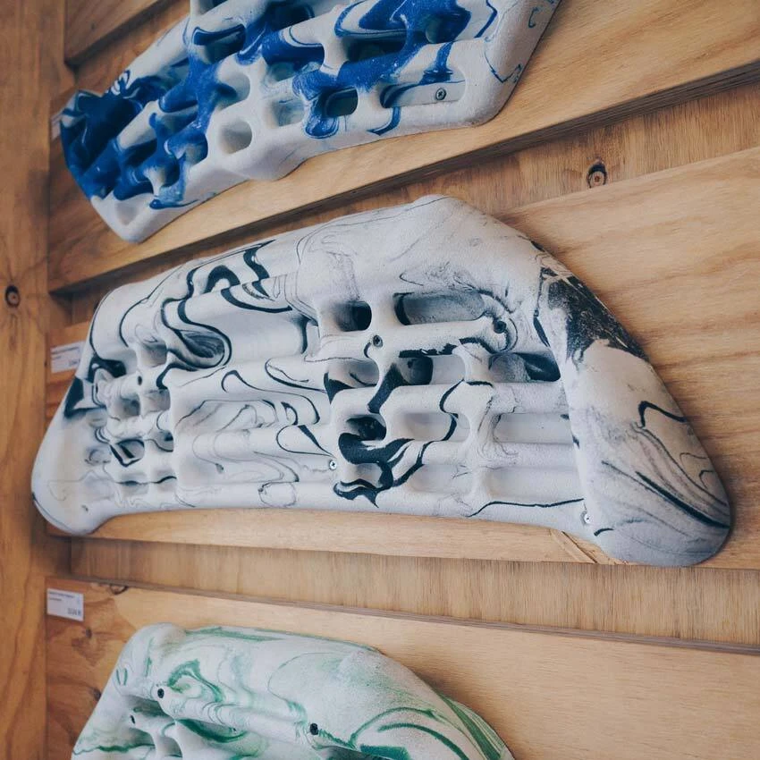 The hold selection includes 11 pockets (2, 3, and 4 fingers – from tips to 2nd joint), 4 central edges, top mounted jugs, and both rounded and flat slopers. It is ergonomically curved to reduce joint stress and the possibility of injury. The Contact has a fine-grained texture that is skin friendly. Comes with a training guide, comprehensive instructions, and mounting hardware.